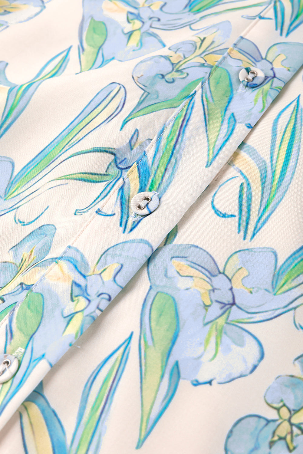 Green Floral Print Shirtcollar Buttoned Short Sleeve Shift Dress