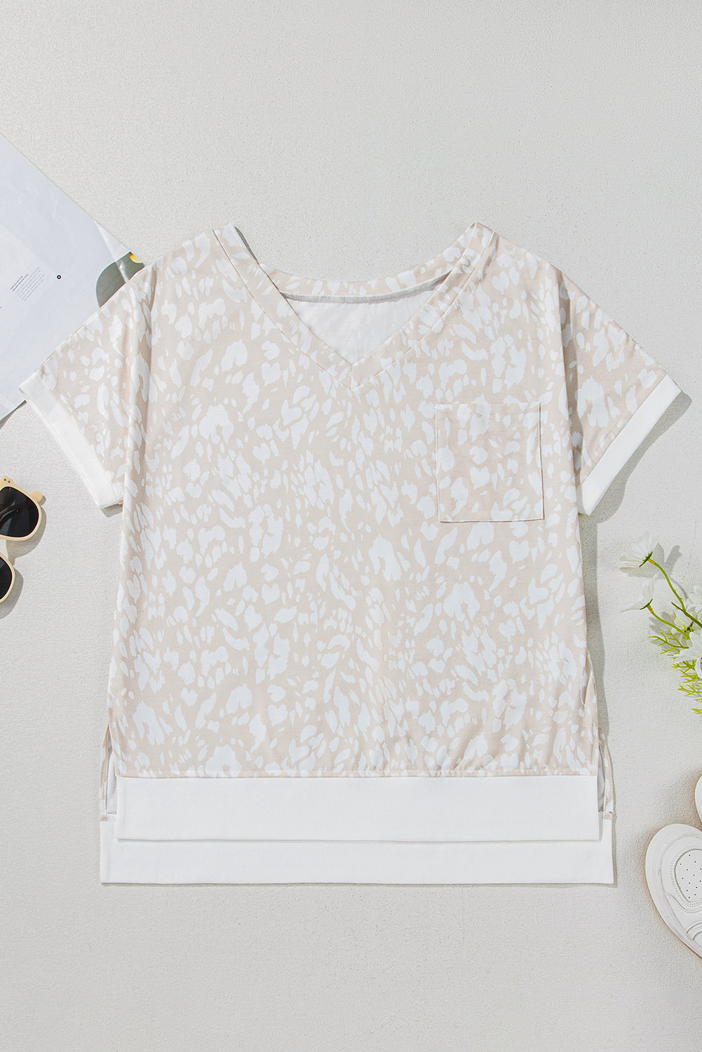Khaki Leopard Print V Neck Side Slit Loose Fit T Shirt