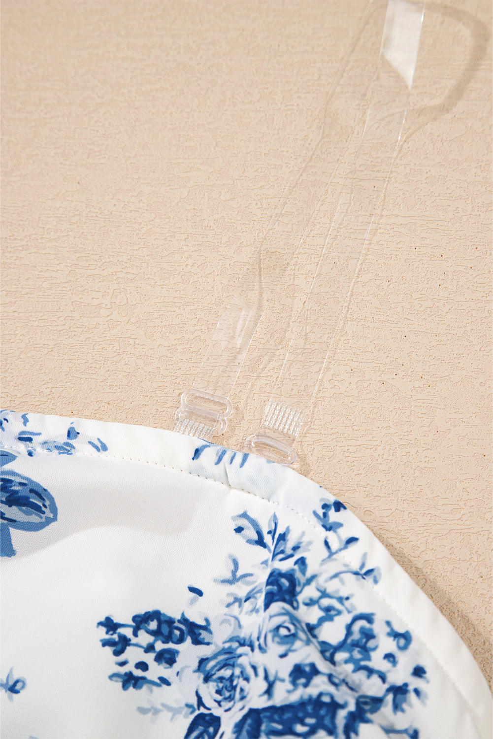 Sky Blue Floral Print Strapless Zipped Back Knot Waist Ruffled Romper